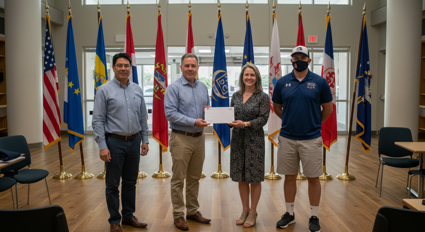 In front of a group of Anne Whiting Real Estate associates and veterans served by Veterans Transition House, James Reid, Executive Director of Veterans Transition House, accepted this generous gift in front of the new Anthony C. and Salvatore H. Alfiero Outreach Center. Located at 1297 Purchase Street, this outreach center will enable Veterans Transition House to serve more veterans in the community, especially those at risk of becoming homeless, experiencing food insecurity, or in need of basic human services.