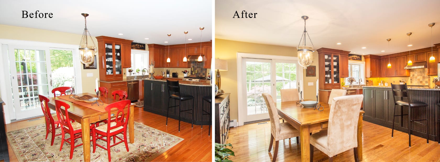 Removing the rug in the dining area and switching out the red chairs with the neutral beige allows potential buyers to see the overall kitchen rather than bringing your eye directly to the red chairs. It also showcases the beauty of the hardwood floors and gives a softer feel with the upholstered chairs.