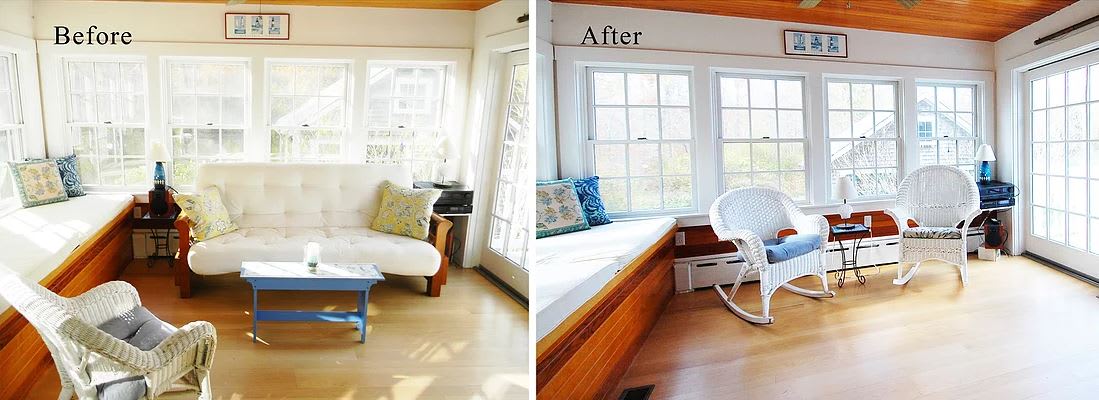 Decorating your home is about personalizing, staging your home is about neutralizing. The sun room appears bigger and brighter by switching out the futon, re-positioning the two rocking chairs and removing some of the personal items. By moving the futon away from the windows you are opening up the space and letting in the natural light.
